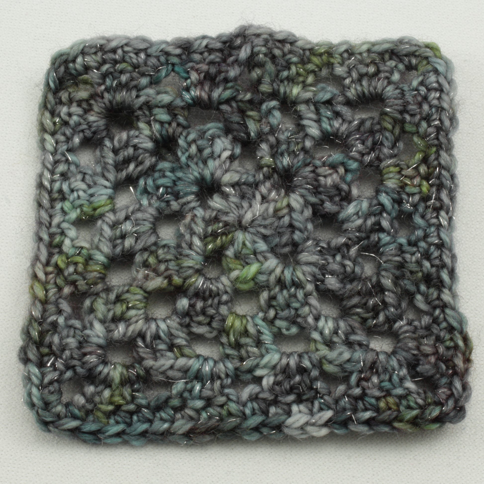 Due to the spontaneous nature of this dye method, skeins can vary greatly. The swatch pictured was crocheted with a 3mm hook and measures 2.75" square.