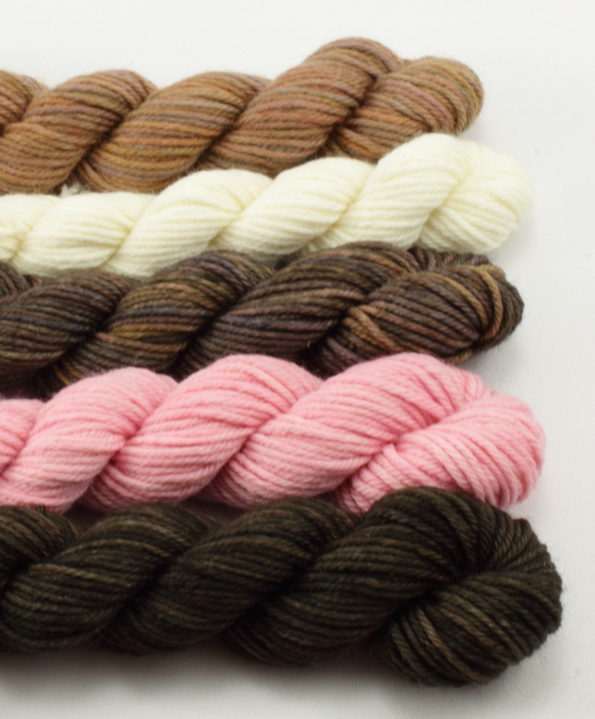 Colorwork sets are groupings of mini skeins perfect for stranded colorwork, stripes, granny squares, or any project that requires small amounts of several colors. I've put these together to work with the Doodle Deck colorwork charts designed by Jamie Lomax and Pacific Knit Co., but they will work with most colorwork charts and projects. I recommend pairing the sets with a contrasting or neutral background color.