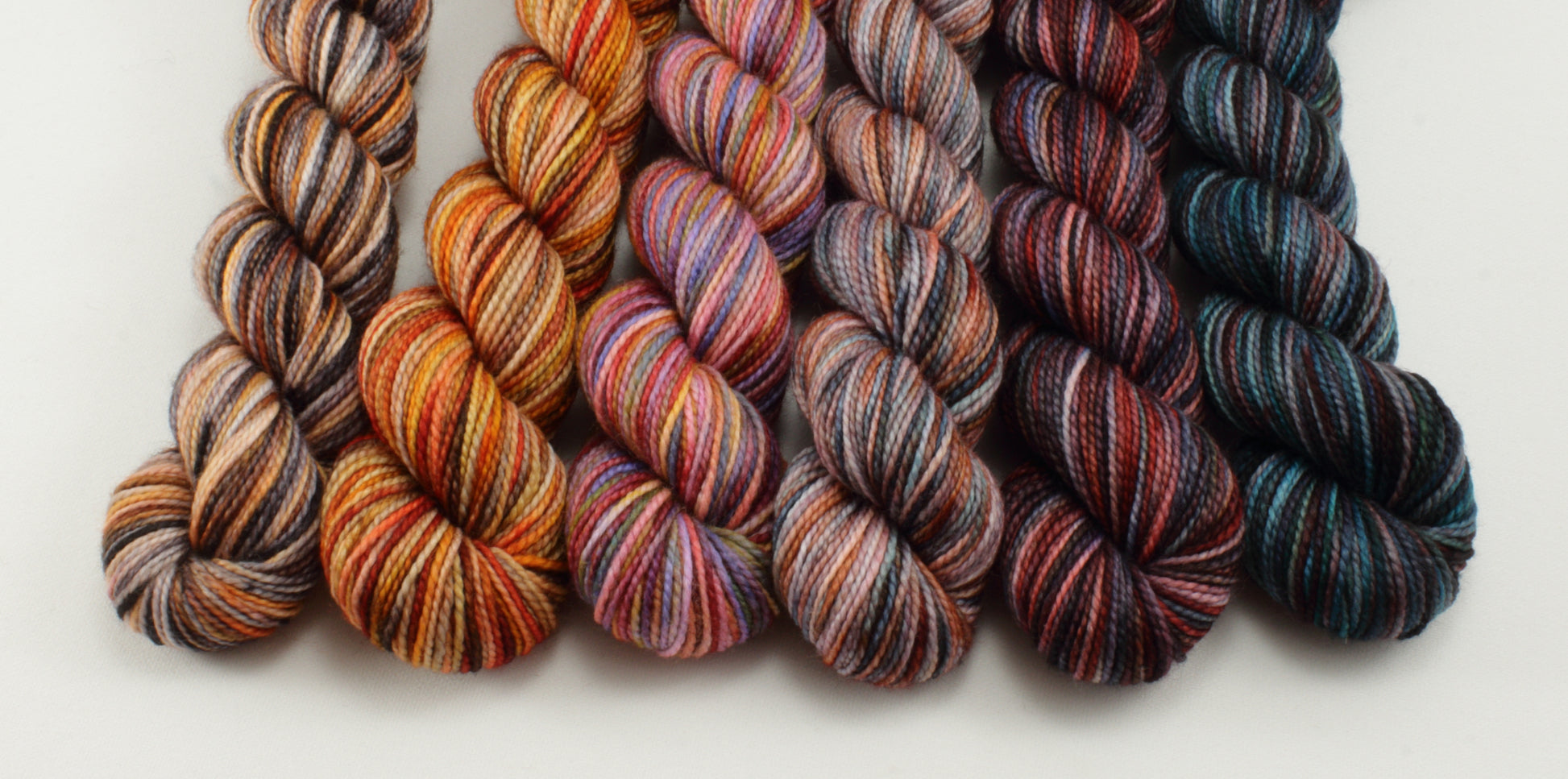 This set of fingering weight yarns features a collection of my popular variegated colorways on my Jest Sock base. Jest is a wonderful 2ply yarn a with bouncy twist and the added strength of nylon for long wearing socks and next-to-the-skin soft garments.