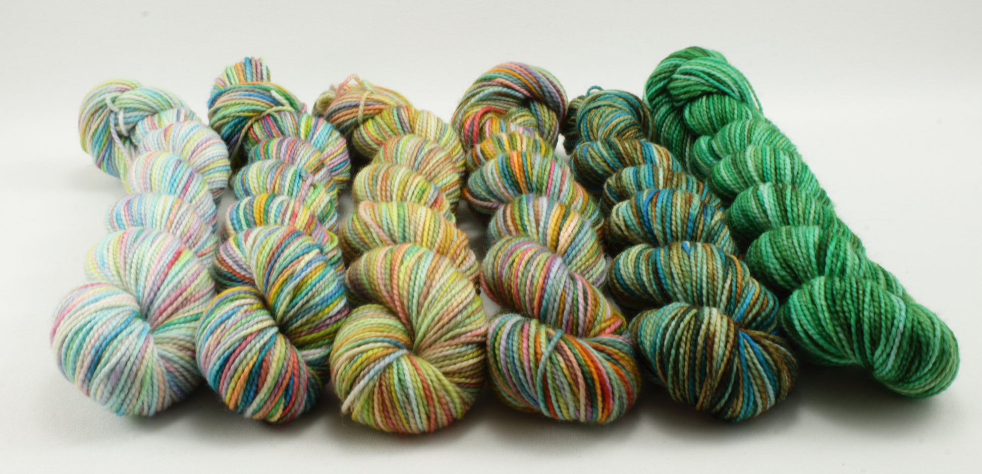 This set of fingering weight yarns features a collection of my popular variegated colorways on my Jest Sock base. Jest is a wonderful 2ply yarn a with bouncy twist and the added strength of nylon for long wearing socks and next-to-the-skin soft garments.